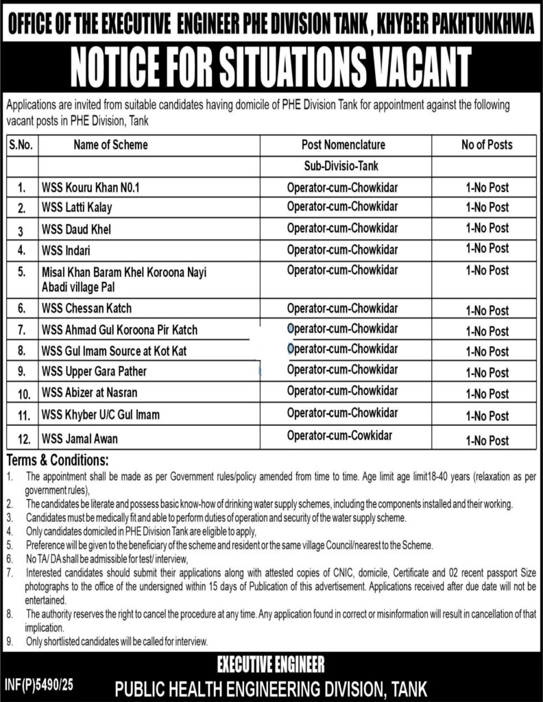 Tank, Khyber Pakhtunkhwa – The Public Health Engineering (PHE) Division, Tank, has issued a recruitment notice to fill multiple vacant positions of Operator-cum-Chowkidar. Applications are invited from suitable candidates holding domicile of the PHE Division Tank area. This is a local opportunity for residents to secure government employment within their division.