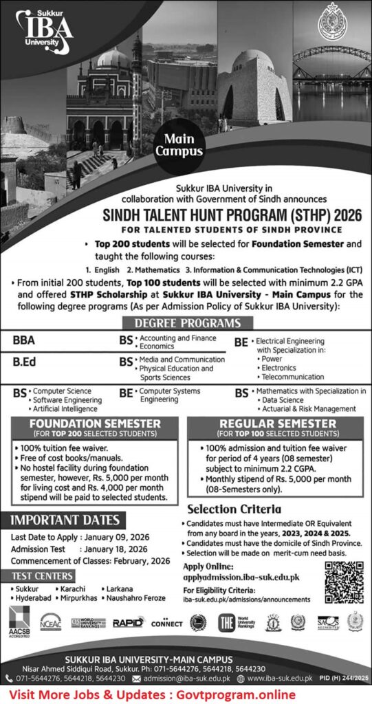 Sukkur, Sindh – Sukkur IBA University, in collaboration with the Government of Sindh, has officially launched the Sindh Talent Hunt Program (STHP) 2026. This prestigious initiative is designed to discover and nurture talented students from across Sindh province by providing them with fully-funded educational opportunities at one of Pakistan’s leading universities.