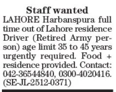 DriverHarbanspura, LahoreFull-TimeMust be a Retired Army Personnel